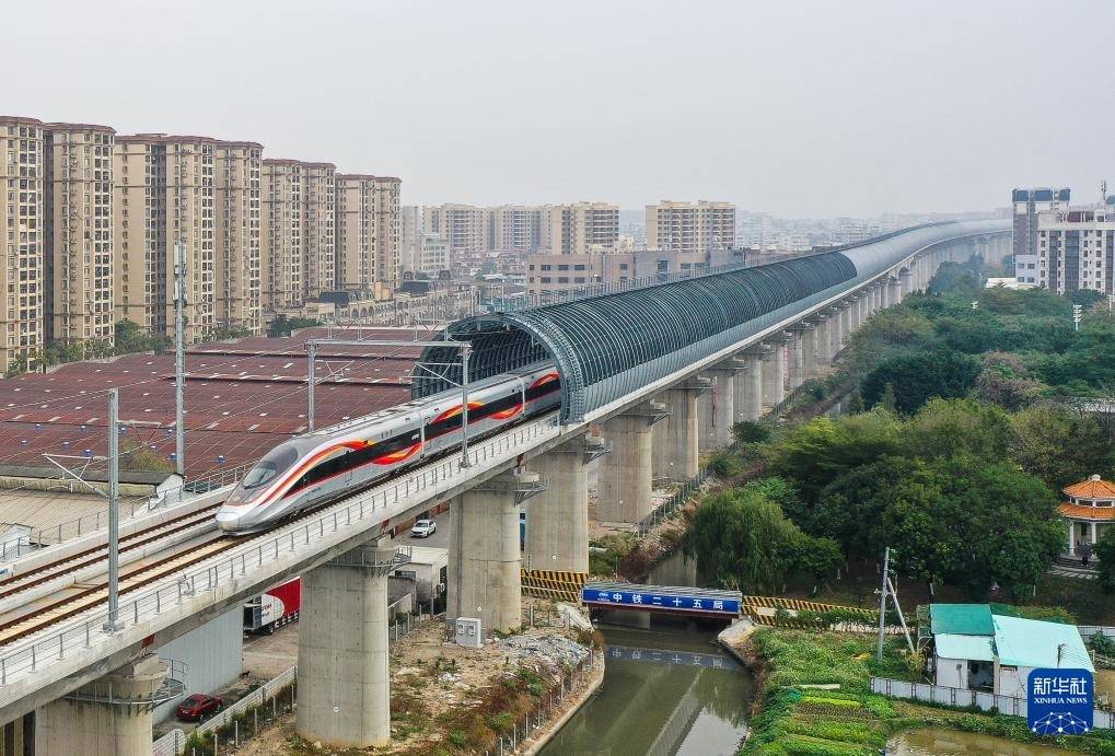 12月22日,从广州白云站开往湛江北站的列车穿过高中立交特大桥“隔音隧道”。