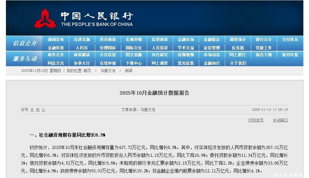 11月13日,央行公布2025年10月金融统计数据报告。数据显示,截至10月末,社会融资规模存量为437.72万亿元,同比增长8.5%,增速连续三个月回落。