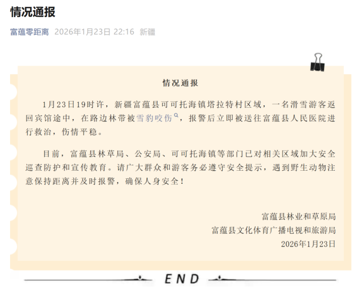 此前据富蕴县官方通报:1月23日19时许,新疆富蕴县可可托海镇塔拉特村区域,一名滑雪游客返回宾馆途中,在路边林带被雪豹咬伤,报警后立即被送往富蕴县人民医院进行救治,伤情平稳。